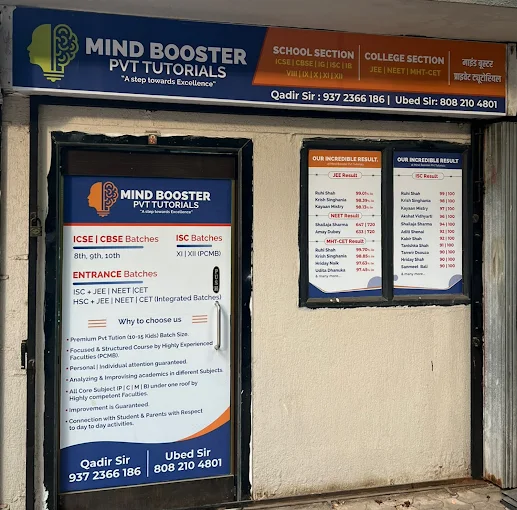 Mind Booster is one of the best private tutorials in Mumbai, offering result-oriented coaching for ICSE, CBSE, and ISC board students from 8th to 12th grade. We specialize in ICSE coaching, CBSE coaching, ISC coaching, and integrated coaching programs that combine the HSC Board syllabus with competitive exam preparation for JEE, NEET, and MHT-CET. Our vision is to help every student unlock their hidden potential. At Mind Booster, we believe that academic success begins with personalized attention, daily performance improvement, and consistent mentoring. Our expert faculty ensures that students not only excel in their board exams but are also well-prepared for engineering and medical entrance exams. Whether you're looking for 8th to 10th ICSE or CBSE coaching, or 11th and 12th ISC with JEE/NEET/MHT-CET coaching